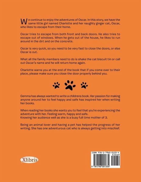 We continue to enjoy the adventures of Oscar. In this story, we have the same little girl named Charlotte and her naughty ginger cat, Oscar, who likes to escape from their home. Oscar tries to escape from both front and back doors. He also tries to escape out of windows. When he gets out of the house, he likes to run around in the dirt and on the concrete. Oscar is very quick, so you need to be very fast to close the doors, or else Oscar is out. What all the family members need to do is shake the cat biscuit tin or call out Oscar's name and he will return home again. Charlotte warns you at the end of the book that if you come over to their place, please make sure you close the door properly behind you.