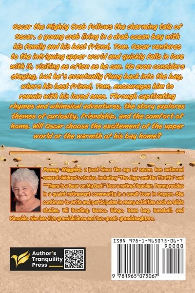 Oscar the Mighty Crab, follows the charming tale of Oscar, a young crab living in a drab ocean bay with his family and his best friend, Tom. One day, Oscar ventures to the intriguing upper world but actually looks forward to the upper world repeatedly. Over and over Oscar travels to the intriguing upper world! He considers staying, but he's flung back into the bay, where His best friend, Tom, encourages him to remain with his loved ones. Through captivating rhymes and whimsical adventures, the story explores themes of curiosity, friendship and the comfort of home, Will Oscar choose excitement of the upper world or the warmth of his bay home?