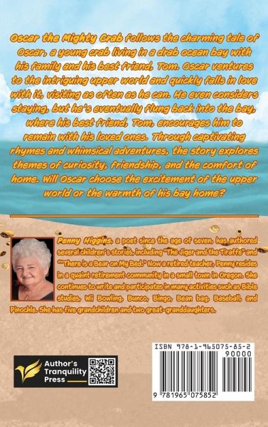 Oscar the Mighty Crab, follows the charming tale of Oscar, a young crab living in a drab ocean bay with his family and his best friend, Tom. One day, Oscar ventures to the intriguing upper world but actually looks forward to the upper world repeatedly. Over and over Oscar travels to the intriguing upper world! He considers staying, but he's flung back into the bay, where His best friend, Tom, encourages him to remain with his loved ones. Through captivating rhymes and whimsical adventures, the story explores themes of curiosity, friendship and the comfort of home, Will Oscar choose excitement of the upper world or the warmth of his bay home?
