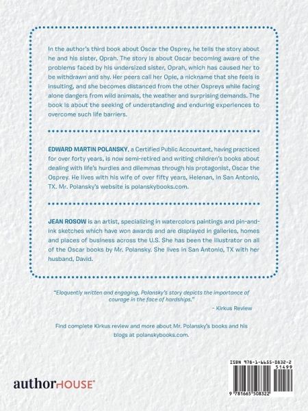 In the author's third book about Oscar the Osprey, he tells the story about he and his sister, Oprah. The story is about Oscar becoming aware of the problems faced by his undersized sister, Oprah, which has caused her to be withdrawn and shy. Her peers call her Opie, a nickname that she feels is insulting, and she becomes distanced from the other Ospreys while facing alone dangers from wild animals, the weather and surprising demands. The book is about the seeking of understanding and enduring experiences to overcome such life barriers.