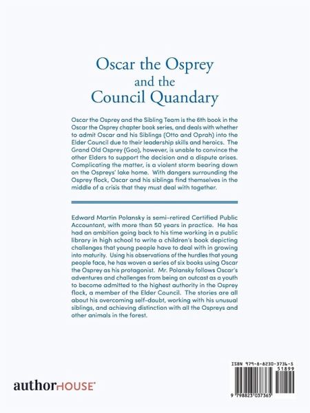 Oscar the Osprey and the Sibling Team is the 6th book in the Oscar the Osprey chapter book series, and deals with whether to admit Oscar and his Siblings (Otto and Oprah) into the Elder Council due to their leadership skills and heroics. The Grand Old Osprey (Goo), however, is unable to convince the other Elders to support the decision and a dispute arises. Complicating the matter, is a violent storm bearing down on the Ospreys' lake home. With dangers surrounding the Osprey flock, Oscar and his siblings find themselves in the middle of a crisis that they must deal with together.