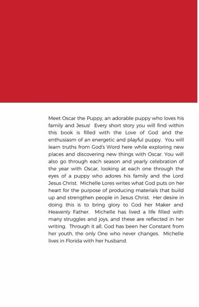 Meet Oscar the Puppy, an adorable puppy who loves his family and Jesus! Every short story you will find within this book is filled with the Love of God and the enthusiasm of an energetic and playful puppy. You will learn truths from God's Word here while exploring new places and discovering new things with Oscar. You will also go through each season and yearly celebration of the year with Oscar, looking at each one through the eyes of a puppy who adores his family and the Lord Jesus Christ. Michelle Lores writes what God puts on her heart for the purpose of producing materials that build up and strengthen people in Jesus Christ. Her desire in doing this is to bring glory to God her Maker and Heavenly Father. Michelle has lived a life filled with many struggles and joys, and these are reflected in her writing. Through it all, God has been her Constant from her youth, the only One who never changes. Michelle lives in Florida with her husband.