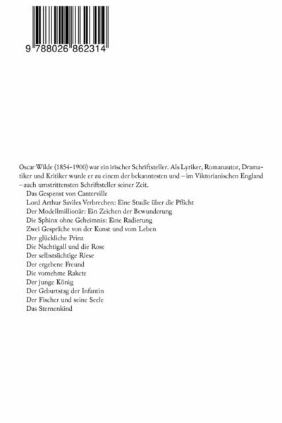 Oscar Wilde (1854-1900) war ein irischer Schriftsteller. Als Lyriker, Romanautor, Dramatiker und Kritiker wurde er zu einem der bekanntesten und - im Viktorianischen England - auch umstrittensten Schriftsteller seiner Zeit. Das Gespenst von Canterville Lord Arthur Saviles Verbrechen: Eine Studie über die Pflicht Der Modellmillionär: Ein Zeichen der Bewunderung Die Sphinx ohne Geheimnis: Eine Radierung Zwei Gespräche von der Kunst und vom Leben Der glückliche Prinz Die Nachtigall und die Rose Der selbstsüchtige Riese Der ergebene Freund Die vornehme Rakete Der junge König Der Geburtstag der Infantin Der Fischer und seine Seele Das Sternenkind
