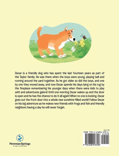 Oscar is a friendly dog who has spent the last fourteen years as part of the Taylor family. He was there when the boys were young, playing ball and running around the yard together. As he got older so did the boys, and one by one they moved away, and now Oscar spends his days lying on his rug by the fireplace remembering his younger days when there were kids to play with and adventures galore! Until one morning Oscar wakes up and the door is open and he has the chance to do it all again! When no one is looking, Oscar goes out the front door into a whole new sunshine-filled world! Follow Oscar on his big adventure as he makes new friends with frogs and fish and friendly neighbors having a day he will never forget.