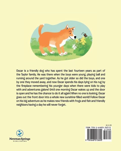 Oscar is a friendly dog who has spent the last fourteen years as part of the Taylor family. He was there when the boys were young, playing ball and running around the yard together. As he got older so did the boys, and one by one they moved away, and now Oscar spends his days lying on his rug by the fireplace remembering his younger days when there were kids to play with and adventures galore! Until one morning Oscar wakes up and the door is open and he has the chance to do it all again! When no one is looking, Oscar goes out the front door into a whole new sunshine-filled world! Follow Oscar on his big adventure as he makes new friends with frogs and fish and friendly neighbors having a day he will never forget.