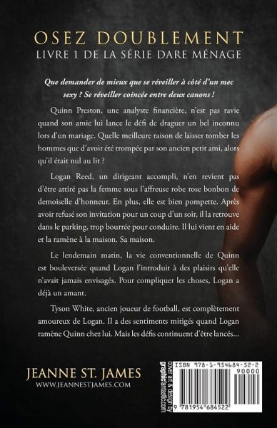 Que demander de mieux que se réveiller à côté d'un mec sexy ? Se réveiller coincée entre deux canons ! Quinn Preston, une analyste financière, n'est pas ravie quand son amie lui lance le défi de draguer un bel inconnu lors d'un mariage. Quelle meilleure raison de laisser tomber les hommes que d'avoir été trompée par son ancien petit ami, alors qu'il était nul au lit ? Logan Reed, un dirigeant accompli, n'en revient pas d'être attiré pas la femme sous l'affreuse robe rose bonbon de demoiselle d'honneur. En plus, elle est bien pompette. Après avoir refusé son invitation pour un coup d'un soir, il la retrouve dans le parking, trop bourrée pour conduire. Il lui vient en aide et la ramène à la maison. Sa maison. Le lendemain matin, la vie conventionnelle de Quinn est bouleversée quand Logan l'introduit à des plaisirs qu'elle n'avait jamais envisagés. Pour compliquer les choses, Logan a déjà un amant. Tyson White, ancien joueur de football, est complètement amoureux de Logan. Il a des sentiments mitigés quand Logan ramène Quinn chez lui. Mais les défis continuent d'être lancés... Note : Ce livre audio de la série est une histoire indépendante et inclut une fin heureuse. Elle est destinée à un public de plus de 18 ans puisqu'elle comporte des scènes HHF entre les trois personnages.