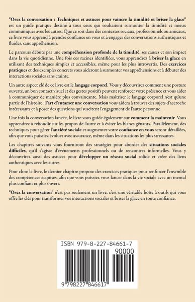 "Osez la conversation : Techniques et astuces pour vaincre la timidité et briser la glace" est un guide pratique destiné à tous ceux qui souhaitent surmonter la timidité et mieux communiquer avec les autres. Que ce soit dans des contextes sociaux, professionnels ou amicaux, ce livre vous apprend à prendre confiance en vous et à engager des conversations authentiques et fluides, sans appréhension. Le parcours débute par une compréhension profonde de la timidité, ses causes et son impact dans la vie quotidienne. Une fois ces racines identifiées, vous apprendrez à briser la glace en utilisant des techniques simples et accessibles, même pour les plus introvertis. Des exercices pratiques et des exemples concrets vous aideront à surmonter vos appréhensions et à débuter des interactions sociales sans crainte. Un autre aspect clé de ce livre est le langage corporel. Vous y découvrirez comment une posture ouverte, un bon contact visuel et des gestes positifs peuvent renforcer votre présence et vous aider à communiquer de manière plus convaincante. Mais maîtriser le langage corporel n'est qu'une partie de l'histoire : l'art d'entamer une conversation vous aidera à trouver des sujets d'accroche intéressants et à poser des questions qui suscitent l'engagement de l'autre personne. Une fois la conversation lancée, le livre vous guide également sur comment la maintenir. Vous apprendrez à rebondir sur les propos de l'autre et à éviter les blancs gênants. Parallèlement, des techniques pour gérer l'anxiété sociale et augmenter votre confiance en vous seront détaillées, afin que vous puissiez évoluer avec assurance, même dans les situations les plus stressantes. Les chapitres suivants vous fourniront des stratégies pour aborder des situations sociales difficiles, qu'il s'agisse d'événements professionnels ou de rencontres informelles. Vous y découvrirez aussi des astuces pour développer un réseau social solide et créer des liens authentiques avec les autres. Pour clore le livre, le dernier chapitre propose des exercices pratiques pour renforcer l'ensemble des compétences acquises, afin que vous puissiez vous lancer dans la vie sociale avec un mental plus confiant et plus ouvert. "Osez la conversation" n'est pas seulement un livre, c'est une véritable boîte à outils qui vous offre les clés pour transformer vos interactions sociales et briser la glace en toute confiance.