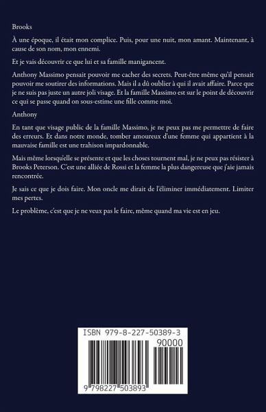 Brooks À une époque, il était mon complice. Puis, pour une nuit, mon amant. Maintenant, à cause de son nom, mon ennemi. Et je vais découvrir ce que lui et sa famille manigancent. Anthony Massimo pensait pouvoir me cacher des secrets. Peut-être même qu'il pensait pouvoir me soutirer des informations. Mais il a dû oublier à qui il avait affaire. Parce que je ne suis pas juste un autre joli visage. Et la famille Massimo est sur le point de découvrir ce qui se passe quand on sous-estime une fille comme moi. Anthony En tant que visage public de la famille Massimo, je ne peux pas me permettre de faire des erreurs. Et dans notre monde, tomber amoureux d'une femme qui appartient à la mauvaise famille est une trahison impardonnable. Mais même lorsqu'elle se présente et que les choses tournent mal, je ne peux pas résister à Brooks Peterson. C'est une alliée de Rossi et la femme la plus dangereuse que j'aie jamais rencontrée. Je sais ce que je dois faire. Mon oncle me dirait de l'éliminer immédiatement. Limiter mes pertes. Le problème, c'est que je ne veux pas le faire, même quand ma vie est en jeu.