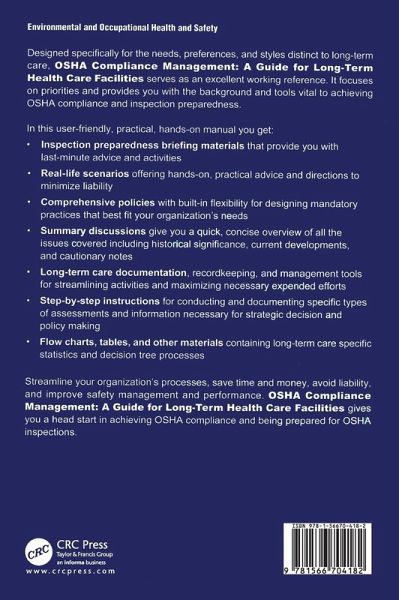 Designed specifically for the needs, preferences, and styles distinct to long-term care OSHA Compliance Management: A Guide for Long Term Health Care serves as an excellent working reference. It focuses on priorities and provides the reader with the background and tools vital to achieving OSHA compliance. The reader will understand how to streamline their organization's processes, save time and money, avoid liability, and improve their safety management and performance. This user-friendly, practical, hands-on manual provides a headstart in achieving OSHA compliance and being prepared for OSHA inspections for long term care facilities.
