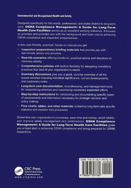Designed specifically for the needs, preferences, and styles distinct to long-term care OSHA Compliance Management: A Guide for Long Term Health Care serves as an excellent working reference. It focuses on priorities and provides the reader with the background and tools vital to achieving OSHA compliance. The reader will understand how to streamline their organization's processes, save time and money, avoid liability, and improve their safety management and performance. This user-friendly, practical, hands-on manual provides a headstart in achieving OSHA compliance and being prepared for OSHA inspections for long term care facilities.