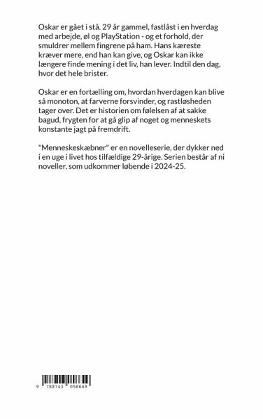 Oskar er gået i stå. 29 år gammel, fastlåst i en hverdag med arbejde, øl og PlayStation, og et forhold, der smuldrer mellem fingrene på ham. Hans kæreste kræver mere, end han kan give, og Oskar kan ikke længere finde mening i det liv, han lever. Indtil den dag, hvor det hele brister. Oskar er en fortælling om, hvordan hverdagen kan blive så monoton, at farverne forsvinder, og rastløsheden tager over. Det er historien om følelsen af at sakke bagud, frygten for at gå glip af noget og menneskets konstante jagt på fremdrift. "Menneskeskæbner" er en novelleserie, der dykker ned i en uge i livet hos tilfældige 29-årige. Serien består af ni noveller, som udkommer løbende i 2024-25.