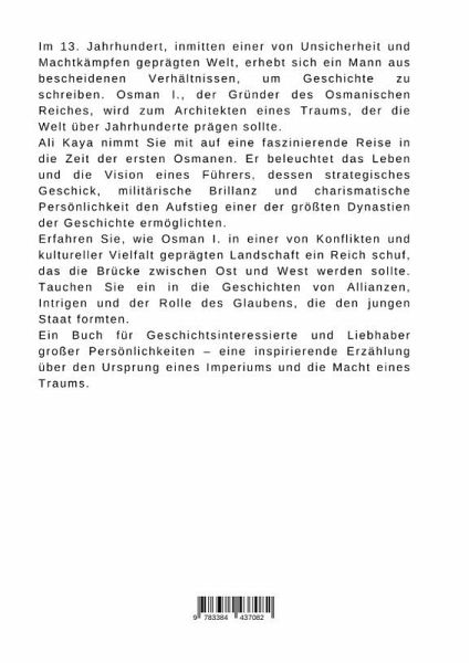 Im 13. Jahrhundert, inmitten einer von Unsicherheit und Machtkämpfen geprägten Welt, erhebt sich ein Mann aus bescheidenen Verhältnissen, um Geschichte zu schreiben. Osman I., der Gründer des Osmanischen Reiches, wird zum Architekten eines Traums, der die Welt über Jahrhunderte prägen sollte.Ali Kaya nimmt Sie mit auf eine faszinierende Reise in die Zeit der ersten Osmanen. Er beleuchtet das Leben und die Vision eines Führers, dessen strategisches Geschick, militärische Brillanz und charismatische Persönlichkeit den Aufstieg einer der größten Dynastien der Geschichte ermöglichten.Erfahren Sie, wie Osman I. in einer von Konflikten und kultureller Vielfalt geprägten Landschaft ein Reich schuf, das die Brücke zwischen Ost und West werden sollte. Tauchen Sie ein in die Geschichten von Allianzen, Intrigen und der Rolle des Glaubens, die den jungen Staat formten.Ein Buch für Geschichtsinteressierte und Liebhaber großer Persönlichkeiten - eine inspirierende Erzählung über den Ursprung eines Imperiums und die Macht eines Traums.