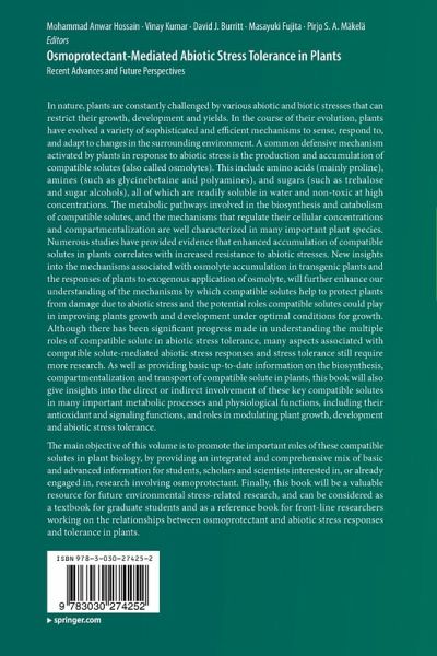 In this book, Osmoprotectant-mediated abiotic stress tolerance in plants: recent advances and future perspectives, we present a collection of 16 chapters written by leading experts engaged with compatible solute-induced abiotic stress tolerance in plants. The main objective of this volume is to promote the important roles of these compatible solutes in plant biology, by providing an integrated and comprehensive mix of basic and advanced information for students, scholars and scientists interested in, or already engaged in, research involving osmoprotectant. Finally, this book will be a valuable resource for future environmental stress-related research, and can be considered as a textbook for graduate students and as a reference book for front-line researchers working on the relationships between osmoprotectant and abiotic stress responses and tolerance in plants.