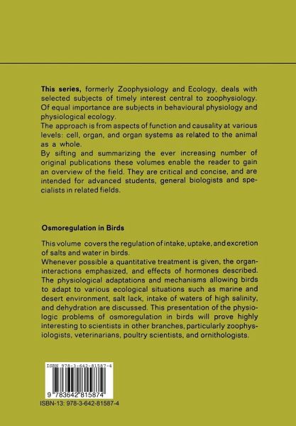 The approach of this treatise is physiological throughout. In the eyes of the author it answers the rhetorical question raised by Maurice B. Visscher at the Physiology Congress in Washington D. C. in 1968: Does physiology exist? What he meant by this question was whether the fields of cellular physiology and physiology of the various organ systems had become so large that physiology as such had vanished. The firm answer is that physiology does indeed exist. Although it is important to study physiological problems at the subcellular level, it is importan- and equally difficult - to study organ regulation at the cellular level, organ interaction, and integration into the whole organism. An account of avian osmoregulation from an integrated point of view is attempted in this book. Since reading Homer W. Smith's From Fish to Philosopher and August Krogh's Osmoregulation in Aquatic Animals verte brate osmoregulation has been in the center of the author's interest. The focus was set onavian osmoregulation after personal contact with the School of Krogh when working in the laboratory of Bodil M. Schmidt-Nielsen. The fundamental concepts and isotope techniques introduced by Hans H. Ussing have been of constant inspiration. An excellent example for the study of osmoregulation at the cellular level was given by the late Jean Maetz. The writing of this book was suggested by Donald S. Farner who is thanked for thorough editorial assistance, and especially with help in the subtle semantic peculiarities of the English language.
