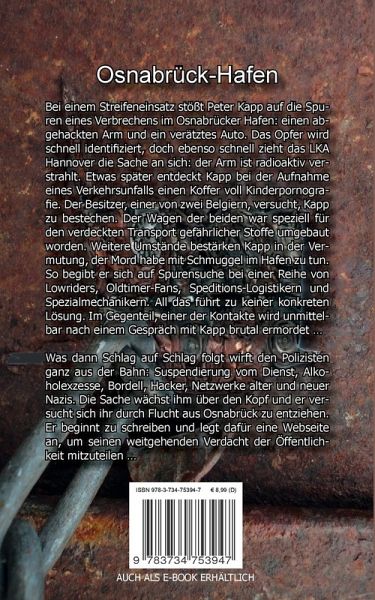 Bei einem Streifeneinsatz stößt Peter Kapp auf die Spuren eines Verbrechens im Osnabrücker Hafen: einen abgehackten Arm und ein verätztes Auto. Das Opfer wird schnell identifiziert, doch ebenso schnell zieht das LKA Hannover die Sache an sich: der Arm ist radioaktiv verstrahlt. Etwas später entdeckt Kapp bei der Aufnahme eines Verkehrsunfalls einen Koffer voll Kinderpornografie. Der Besitzer, einer von zwei Belgiern, versucht, Kapp zu bestechen. Der Wagen der beiden war speziell für den verdeckten Transport gefährlicher Stoffe umgebaut worden. Weitere Umstände bestärken Kapp in der Vermutung, der Mord habe mit Schmuggel im Hafen zu tun. So begibt er sich auf Spurensuche bei einer Reihe von Lowriders, Oldtimer-Fans, Speditions-Logistikern und Spezialmechanikern. All das führt zu keiner konkreten Lösung. Im Gegenteil, einer der Kontakte wird unmittelbar nach einem Gespräch mit Kapp brutal ermordet...Was dann Schlag auf Schlag folgt, wirft den Polizisten ganz aus der Bahn: Suspendierung vom Dienst, Alkoholexzesse, Bordell, Hacker, Netzwerke alter und neuer Nazis. Die Sache wächst ihm über den Kopf und er versucht sich ihr durch Flucht aus Osnabrück zu entziehen. Er beginnt zu schreiben und legt dafür eine Webseite an, um seinen weitgehenden Verdacht der Öffentlichkeit mitzuteilen...