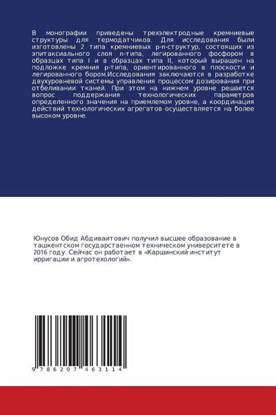 V monografii priwedeny trehälektrodnye kremniewye struktury dlq termodatchikow. Dlq issledowaniq byli izgotowleny 2 tipa kremniewyh p-n-struktur, sostoqschih iz äpitaxial'nogo sloq n-tipa, legirowannogo fosforom w obrazcah tipa I i w obrazcah tipa II, kotoryj wyraschen na podlozhke kremniq p-tipa, orientirowannogo w ploskosti i legirowannogo borom.Issledowaniq zaklüchaütsq w razrabotke dwuhurownewoj sistemy uprawleniq processom dozirowaniq pri otbeliwanii tkanej. Pri ätom na nizhnem urowne reshaetsq wopros podderzhaniq tehnologicheskih parametrow opredelennogo znacheniq na priemlemom urowne, a koordinaciq dejstwij tehnologicheskih agregatow osuschestwlqetsq na bolee wysokom urowne.