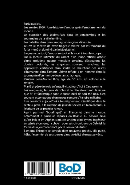 Paris irradié. Ses catacombes et ses souterrains. Son quotidien. Les batailles dans une campagne française des années 2060 après l'embrasement. Une histoire d'amour. Tel est le théâtre de cette tragédie relatée par les témoins du futur mené et dominé par le Magistériel. La guerre partout, l'amour surtout et la mort à tous les coups. Par la lecture intimiste du carnet d'un jeune officier, acteur d'une troisième guerre mondiale certaine, je vous ferai découvrir les doutes profonds, les angoisses souvent maladives, les apparentes certitudes d'un soldat se cherchant des restes d'humanité dans l'amour, ultime refuge d'un homme dans la tourmente d'un monde devenant chaotique.