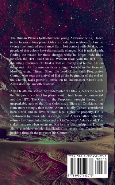 The Human Planets Collective sent young Ambassador Kaj Deder to the former colony planet Ostakis to establish relations. But in the twenty-five hundred years since Earth lost contact with Ostakis, the people of that colony have dramatically changed. Kaj is tasked with finding the reason for these changes while he forges trade links between the HPC and Ostakis. Without trade with the HPC, the dwindling resources of Ostakis will ultimately end human life on the planet. But his mission faces a huge obstacle in the form of Most Reverend Thyenn Sharr, the head of the Faith Progressive Church, who sees the arrival of Kaj as the beginning of the end of the Church. Kaj’s powerful attraction to Trademaster Klath’s son, Arlan does not smooth relations. Arlan Klath, the son of the Trademaster of Ostakis, bears the secret that the pious people of his planet want to hide from the homeworld and the HPC. The Curse of the Unspoken, wrought through the unspeakable acts of the First Colonists, afflicts all Ostakians, but some more strongly than others. Arlan is totally Cursed, considered born sinful and he lives without legal rights or property. He is scrutinized by Sharr who is enraged that Arlan’s father defiantly refuses to submit Arlan to a cruel act to "redeem" Arlan’s soul. The stakes increase when Arlan and Kaj form a relationship that Thyenn Sharr considers ample justification to usurp the Trademaster position through the power of his Church.