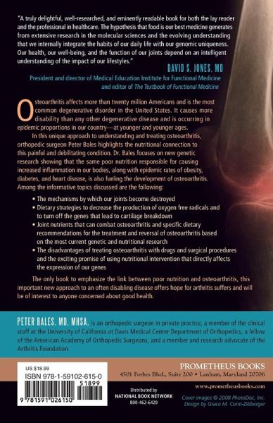 Osteoarthritis affects over 20 million Americans and is the most common degenerative disorder in the United States. It causes more disability than any other degenerative disease and is occurring in epidemic proportions in our country.In this novel approach to understanding and treating osteoarthritis, orthopedic surgeon Peter Bales highlights the nutritional connection to this painful and debilitating condition. Dr. Bales focuses on new genetic research, which shows that the same poor nutrition responsible for causing increased inflammation in our bodies, along with epidemic rates of obesity, diabetes, and heart disease, is also fueling the development of osteoarthritis. Among the topics discussed are the following:*The mechanisms by which our joints become destroyed. The culprits are increased inflammation, increased oxygen free radicals causing our joints to "rust" from chronically elevated blood sugar levels, and hormonal imbalance.*Dietary strategies to decrease the production of oxygen free radicals and to turn off genes that lead to cartilage breakdown.*Joint nutrients that can combat osteoarthritis and specific dietary recommendations for the treatment and reversal of osteoarthritis based on the most current genetic and nutritional research.*The disadvantages of treating osteoarthritis with drugs and the exciting promise of using nutritional intervention that directly affects the expression of our genes.The only book to emphasize the link between poor nutrition and this often-disabling disease, Osteoarthritis: Preventing and Healing without Drugs offers hope for arthritis sufferers and will be of interest to anyone concerned about good health.