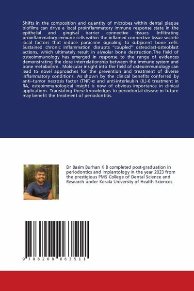 Shifts in the composition and quantity of microbes within dental plaque biofilms can drive a local proinflammatory immune response state in the epithelial and gingival barrier connective tissues. Infiltrating proinflammatory immune cells within the inflamed connective tissue secrete local factors that induce paracrine signaling to subjacent bone cells. Sustained chronic inflammation disrupts "coupled" osteoclast-osteoblast actions, which ultimately result in alveolar bone destruction.The field of osteoimmunology has emerged in response to the range of evidences demonstrating the close interrelationship between the immune system and bone metabolism.. Molecular insight into the field of osteoimmunology can lead to novel approaches for the prevention and treatment of diverse inflammatory conditions. As shown by the clinical benefits conferred by anti-tumor necrosis factor (TNF)- and anti-interleukin (IL)-6 treatment in RA, osteoimmunological insight is now of obvious importance in clinical applications. Translating these knowledges to periodontal disease in future may benefit the treatment of periodontitis.