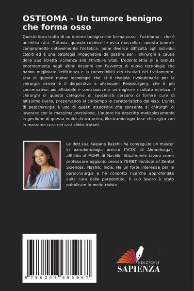 Questo libro tratta di un tumore benigno che forma osso - l'osteoma - che è un'entità rara. Tuttavia, quando colpisce le ossa mascellari, questo tumore compromette notevolmente l'estetica, pone diverse difficoltà agli individui colpiti ed è una patologia impegnativa da gestire per i chirurghi a causa della sua stretta vicinanza alle strutture vitali. L'odontoiatria si è evoluta enormemente negli ultimi decenni con l'avvento di nuove tecnologie che hanno migliorato l'efficienza e la prevedibilità dei risultati del trattamento. Una di queste nuove tecnologie che si è rivelata rivoluzionaria per la chirurgia ossea è il dispositivo a ultrasuoni Peizosurgery, che è più conservativo, più affidabile e contribuisce a un migliore risultato estetico. I chirurghi di questa categoria di specialisti cercano di fornire cure di altissimo livello, preservando al contempo le caratteristiche del viso. L'unità di pezochirurgia è uno di questi dispositivi che consente ai chirurghi di lavorare con la massima precisione. L'autore ha descritto meticolosamente la gestione di questa entità clinica unica, illustrando ogni fase chirurgica con la massima cura nei casi clinici trattati.