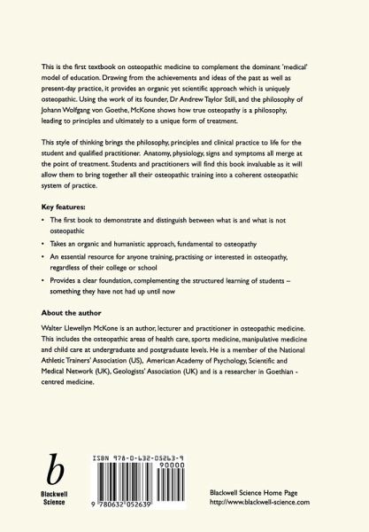 This is the first textbook on osteopathic medicine to complement the dominant 'medical' model of education. Drawing from the achievements and ideas of the past as well as present-day practice, it provides an organic yet scientific approach which is uniquely osteopathic. Using the work of its founder, Dr. Andrew Taylor Still, and the philosophy of Johann Wolfgang von Goethe, McKone shows how true osteopathy is a philosophy, leading to principles and ultimately to a unique form of treatment. This style of thinking brings the philosophy, principles and clinical practice to life for the student and qualified practitioner. Anatomy, physiology, signs and symptoms all merge at the point of treatment. Students and practitioners will find this book invaluable as it will allow them to bring together all their osteopathic training into a coherent osteopathic system of practice. Key features: * The first book to demonstrate and distinguish between what is and what is not osteopathic * Takes an organic and humanistic approach, fundamental to osteopathy * An essential resource for anyone training, practising or interested in osteopathy, regardless of their college or school * Provides a clear foundation, complementing the structured learning of students - something they have not had up until now
