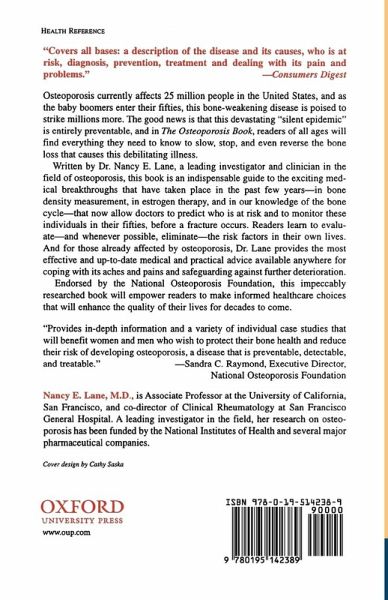Osteoporosis currently affects 25 million people in the United States, and as the baby boomers enter their fifties, this bone-weakening disease is poised to strike millions more. Because of this disease, many older people will suffer from a bone fracture at some point , and far too many of these fractures will result in permanent disability. The good news is that this devastating "silent epidemic" is entirely preventable, and in The Osteoporosis Book, readers of all ages will find everything they need to know to slow, stop, and even reverse the bone loss that causes this crippling disease. Written by Dr. Nancy E. Lane, a leading investigator and clinician in the field of osteoporosis, it is an indispensable guide to the exciting medical breakthroughs that have taken place in the past few years--in bone density measurement, in oestrogen therapy, and in our knowledge of the bone cycle--that now allow doctors to predict who is at risk and to monitor these individuals in their fifties, before a fracture occurs. Readers learn to evaluate--and whenever possible, eliminate--the risk factors in their own lives. "What vitamins should I take? Is hormone replacement therapy right for me? And what about exercise?" The answers are here. And for those already affected by osteoporosis, Dr. Lane provides the most effective and up-to-date medical and practical advice available anywhere for coping with its aches and pains and safeguarding against further deterioration. Impeccably researched and reassuringly accessible, The Osteoporosis Book empowers readers to make informed healthcare choices that will enhance the quality of their lives for decades to come. It has been endorsed by the National Osteoporosis Foundation.
