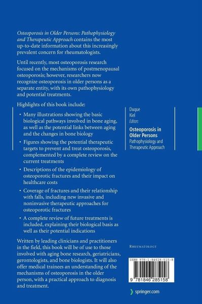 "The authors of this multiauthored book bring together new information on the molecular biology of bone physiology in this examination of osteoporosis in older persons. ... The intended audience includes all health practitioners who treat older patients with osteoporosis. Research scientists in the area will find this book useful as well. ... This book's demonstration of the complex relationship of bone health to adipose tissue and several powerful hormones will stimulate new thinking in the area of osteoporosis." (David O. Staats, Doody's Review Service, August, 2008)