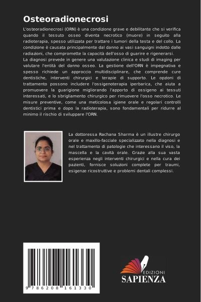 L'osteoradionecrosi (ORN) è una condizione grave e debilitante che si verifica quando il tessuto osseo diventa necrotico (muore) in seguito alla radioterapia, spesso utilizzata per trattare i tumori della testa e del collo. La condizione è causata principalmente dal danno ai vasi sanguigni indotto dalle radiazioni, che compromette la capacità dell'osso di guarire e rigenerarsi.La diagnosi prevede in genere una valutazione clinica e studi di imaging per valutare l'entità del danno osseo. La gestione dell'ORN è impegnativa e spesso richiede un approccio multidisciplinare, che comprende cure dentistiche, interventi chirurgici e terapie di supporto. Le opzioni di trattamento possono includere l'ossigenoterapia iperbarica, che aiuta a promuovere la guarigione migliorando l'apporto di ossigeno ai tessuti interessati, e lo sbrigliamento chirurgico per rimuovere l'osso necrotico. Le misure preventive, come una meticolosa igiene orale e regolari controlli dentistici prima e dopo la radioterapia, sono fondamentali per ridurre al minimo il rischio di sviluppare l'ORN.