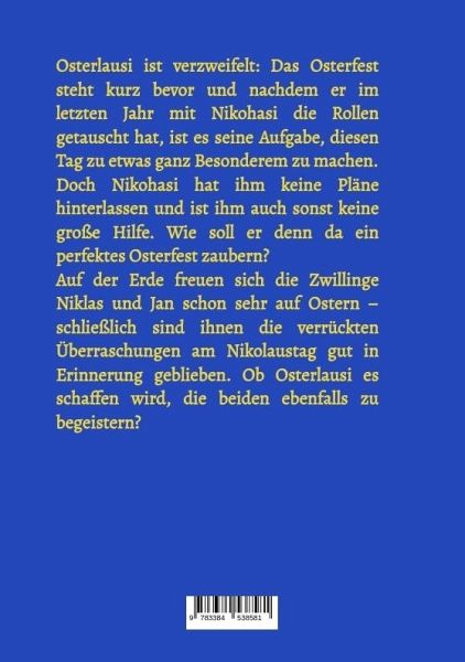 Osterlausi und Nikohasi ist ein humorvolles Kinderbuch zum Vorlesen. Es handelt sich um den zweiten Band eines Zweiteilers, bei dem Nikolaus und Osterhase die Rollen getauscht haben. Osterlausi möchte den Kindern auf der Erde ein perfektes Osterfest bieten. Die Kinder auf der Erde erhoffen sich jedoch - ähnlich wie an Nikolaus - einen ganz besonderen Tag voller Überraschungen. Ein Glück hat Nikohasi seine Finger im Spiel. Denn der möchte auch sehen, was Osterlausi sich alles ausdenkt, wenn er einmal keinen perfekten Plan hat. Das Ergebnis wird selbst Erwachsene zum Schmunzeln bringen.Die Bücher bauen in der Rahmenhandlung zwar aufeinander auf, können aber problemlos unabhängig voneinander gelesen werden.