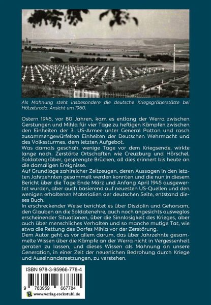 Autor: Rainer Lämmerhirt; Herausgeber: Westthüringer Heimatschriften, Band 28 - Veröffentlichungen des Heimat- und Verkehrsvereins Mihla e.V., Taschenbuch, 128 Seiten mit über 90 Fotos und Abbildungen.ÜBER DAS BUCH:Ostern 1945, vor 80 Jahren, kam es entlang der Werra zwischen Gerstungen und Mihla für vier Tage zu heftigen Kämpfen zwischen den Einheiten der 3. US-Armee unter General Patton und rasch zusammengewürfelten Einheiten der Deutschen Wehrmacht und des Volkssturmes, dem letzten Aufgebot.Was damals geschah, wenige Tage vor dem Kriegsende, wirkte lange nach. Zerstörte Ortschaften wie Creuzburg und Hörschel, Soldatengräber, gesprengte Brücken, all dies erinnert bis heute an die damaligen Ereignisse.Auf Grundlage zahlreicher Zeitzeugen, deren Aussagen in den letzten Jahrzehnten gesammelt werden konnten und die nun in diesem Bericht über die Tage Ende März und Anfang April 1945 ausgewertet wurden, aber auch basierend auf neuesten US-Quellen und den wenigen erhaltenen Materialien der deutschen Seite, entstand dieses Buch.In erschreckender Weise berichtet es über Disziplin und Gehorsam, den Glauben an die Soldatenehre, auch noch angesichts ausweglos erscheinender Situationen, über die Sinnlosigkeit des Krieges, aber auch über menschliches Verhalten und so manche mutige Tat, wie etwa die Rettung des Dorfes Mihla vor der Zerstörung. Dem Autor geht es vor allem darum, das über Jahrzehnte gesammelte Wissen über die Kämpfe an der Werra nicht in Vergessenheit geraten zu lassen, und dieses Wissen als Mahnung an unsere Generation, in einer Zeit der neuerlichen Bedrohung durch Kriege und Auseinandersetzungen, zu verstehen.