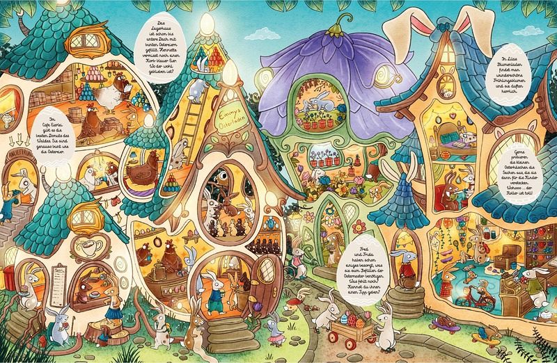 Öffne einfach das Wimmelbuch und komm mit in die zauberhafte Osterhasenwelt!