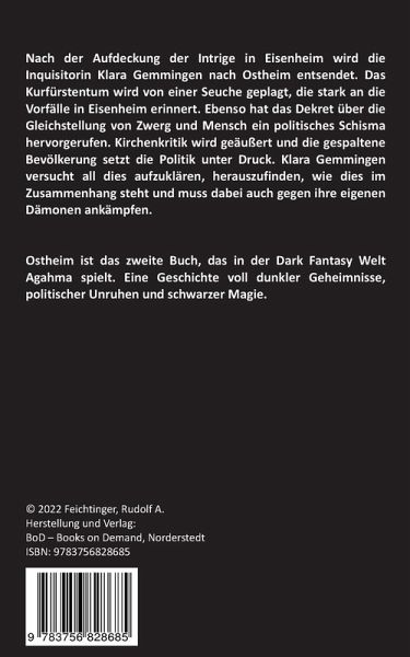 Nach der Aufdeckung der Intrige in Eisenheim wird die Inquisitorin Klara Gemmingen nach Ostheim entsendet. Das Kurfürstentum wird von einer Seuche geplagt, die stark an die Vorfälle in Eisenheim erinnert. Ebenso hat das Dekret über die Gleichstellung von Zwerg und Mensch ein politisches Schisma hervorgerufen. Kirchenkritik wird geäußert und die gespaltene Bevölkerung setzt die Politik unter Druck. Klara Gemmingen versucht all dies aufzuklären, herauszufinden, wie dies im Zusammenhang steht und muss dabei auch gegen ihre eigenen Dämonen ankämpfen.Ostheim ist das zweite Buch, das in der Dark Fantasy Welt Agahma spielt. Eine Geschichte voll dunkler Geheimnisse, politischer Unruhen und schwarzer Magie.