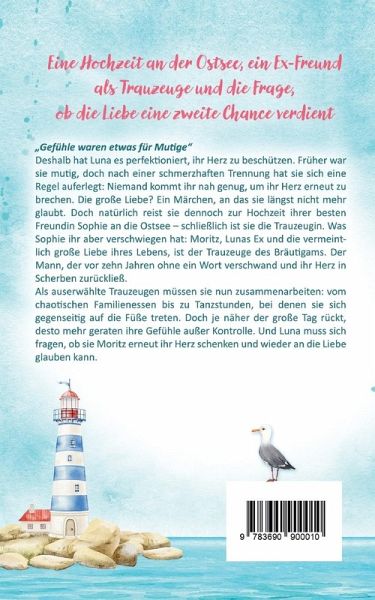 Eine Hochzeit an der Ostsee, ein Ex-Freund als Trauzeuge und die Frage, ob die Liebe eine zweite Chance verdient Die humorvolle Second Chance Romance an der Ostseeküste „Gefühle waren etwas für Mutige" Deshalb hat Luna es perfektioniert, ihr Herz zu beschützen. Früher war sie mutig, doch nach einer schmerzhaften Trennung hat sie sich eine Regel auferlegt: Niemand kommt ihr nah genug, um ihr Herz erneut zu brechen. Die große Liebe? Ein Märchen, an das sie längst nicht mehr glaubt. Doch natürlich reist sie dennoch zur Hochzeit ihrer besten Freundin Sophie an die Ostsee – schließlich ist sie die Trauzeugin. Was Sophie ihr aber verschwiegen hat: Moritz, Lunas Ex und die vermeintlich große Liebe ihres Lebens, ist der Trauzeuge des Bräutigams. Der Mann, der vor zehn Jahren ohne ein Wort verschwand und ihr Herz in Scherben zurückließ. Als auserwählte Trauzeugen müssen sie nun zusammenarbeiten: vom chaotischen Familienessen bis zu Tanzstunden, bei denen sie sich gegenseitig auf die Füße treten. Doch je näher der große Tag rückt, desto mehr geraten ihre Gefühle außer Kontrolle. Und Luna muss sich fragen, ob sie Moritz erneut ihr Herz schenken und wieder an die Liebe glauben kann. Erste Leser:innenstimmen „Zwischen der Ostsee, einer Hochzeit und einem überraschend auftauchenden Ex bietet dieser Liebesroman beste Unterhaltung!" „Ein berührender Küsten-Roman, voller Liebe, Freundschaft und Spaß." „Diese Second Chance Romance ist etwas fürs Herz mit einer großen Prise Humor." „Eine sommerliche Hochzeitsfeier an der Küste und ein überraschendes Wiedersehen könnten zu einem wundervollen Neuanfang führen."