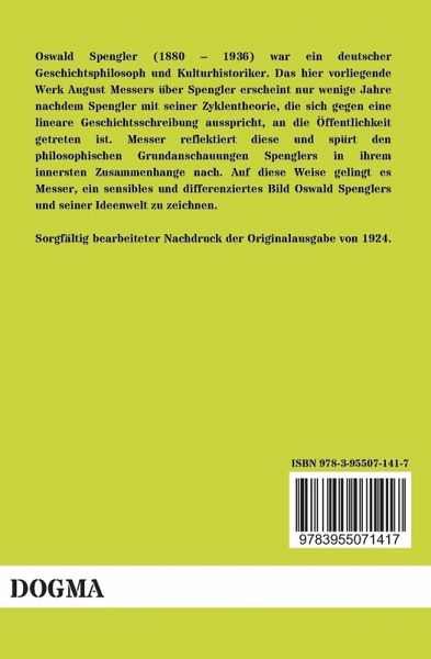 Oswald Spengler (1880-1936) war ein deutscher Geschichtsphilosoph und Kulturhistoriker. Das hier vorliegende Werk August Messers über Spengler erscheint nur wenige Jahre nachdem Spengler mit seiner Zyklentheorie, die sich gegen eine lineare Geschichtsschreibung ausspricht, an die Öffentlichkeit getreten ist. Messer reflektiert diese und spürt den philosophischen Grundanschauungen Spenglers in ihrem innersten Zusammenhange nach. Auf diese Weise gelingt es Messer, ein sensibles und differenziertes Bild Oswald Spenglers und seiner Ideenwelt zu zeichnen.