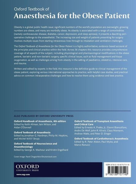 The Oxford Textbook of Anaesthesia for the Obese Patient is an evidence-based account of clinical practice in the field. Chapters are written by experts based in the US, UK, Europe and Australasia to reflect international practice.