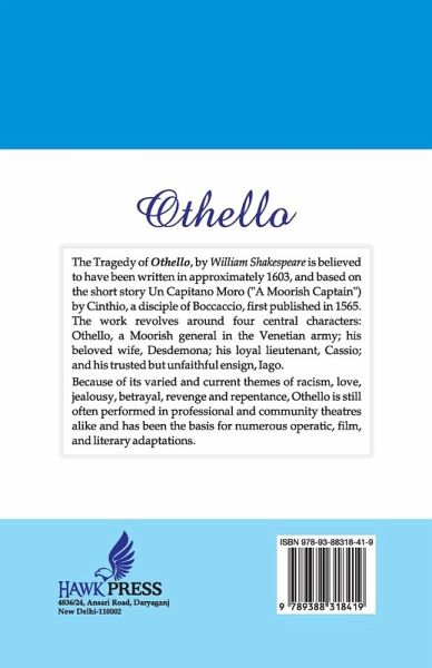 The Tragedy of Othello, by William Shakespeare is believed to have been written in approximately 1603, and based on the short story Un Capitano Moro ("A Moorish Captain") by Cinthio, a disciple of Boccaccio, first published in 1565. The work revolves around four central characters: Othello, a Moorish general in the Venetian army; his beloved wife, Desdemona; his loyal lieutenant, Cassio; and his trusted but unfaithful ensign, Iago. Because of its varied and current themes of racism, love, jealousy, betrayal, revenge and repentance, Othello is still often performed in professional and community theatres alike and has been the basis for numerous operatic, film, and literary adaptations.