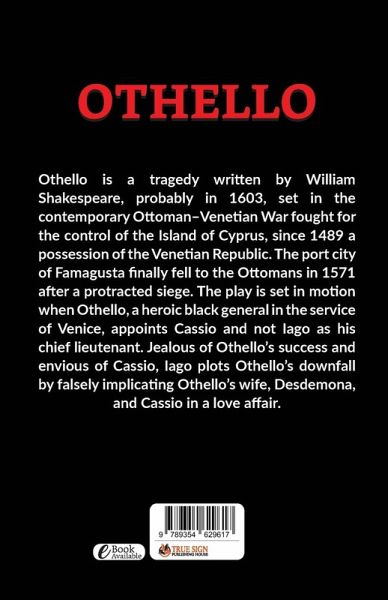 Othello is a tragedy written by William Shakespeare, probably in 1603, set in the contemporary Ottoman-Venetian War fought for the control of the Island of Cyprus, since 1489 a possession of the Venetian Republic. The port city of Famagusta finally fell to the Ottomans in 1571 after a protracted siege. The play is set in motion when Othello, a heroic black general in the service of Venice, appoints Cassio and not Iago as his chief lieutenant. Jealous of Othello's success and envious of Cassio, Iago plots Othello's downfall by falsely implicating Othello's wife, Desdemona, and Cassio in a love affair.…mehr