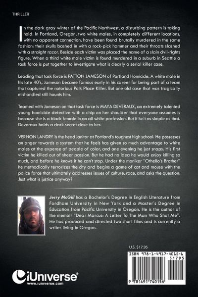 In the dark gray winter of the Pacific Northwest, a disturbing pattern is taking hold. In Portland, Oregon, two white males, in completely different locations, with no apparent connection, have been found brutally murdered in the same fashion: their skulls bashed in with a rock-pick hammer and their throats slashed with a straight razor. Beside each victim was placed the name of a slain civil-rights figure. When a third white male victim is found murdered in a suburb in Seattle a task force is put together to investigate what is clearly a serial killer case. Leading that task force is PATTON JAMESON of Portland Homicide. A white male in his late 40's, Jameson became famous early in his career for being part of a team that captured the notorious Polk Place Killer. But one old case that was tragically mishandled still haunts him. Teamed with Jameson on that task force is MAYA DEVERAUX, an extremely talented young homicide detective with a chip on her shoulder that everyone assumes is because she is a black female in an all white profession. But it isn't as simple as that. Deveraux holds a dark secret close to her. VERNON LANDRY is the head janitor at Portland's toughest high school. He possesses an anger towards a system that he feels has given so much advantage to white males at the expense of people of color, and one evening he just snaps. His first victim he killed out of sheer passion. But he had no idea he would enjoy killing so much, and before he knows it he can't stop. Under the moniker "Othello's Brother" he methodically terrorizes the city and begins a game of cat and mouse with the police force that ultimately addresses issues of culture, race, and asks the question: Just what is justice anyway?