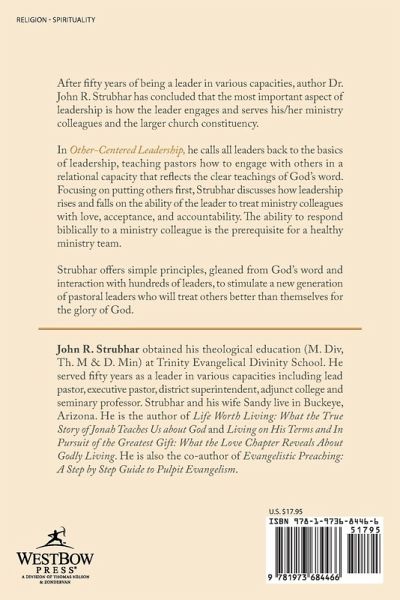 After fifty years of being a leader in various capacities, author Dr. John R. Strubhar has concluded that the most important aspect of leadership is how the leader engages and serves his/her ministry colleagues and the larger church constituency. In Other-Centered Leadership, he calls all leaders back to the basics of leadership, teaching pastors how to engage with others in a relational capacity that reflects the clear teachings of God's word. Focusing on putting others first, Strubhar discusses how leadership rises and falls on the ability of the leader to treat ministry colleagues with love, acceptance, and accountability. The ability to respond biblically to a ministry colleague is the prerequisite for a healthy ministry team. Strubhar offers simple principles, gleaned from God's word and interaction with hundreds of leaders, to stimulate a new generation of pastoral leaders who will treat others better than themselves for the glory of God.