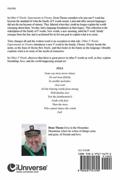 In Other F Words: Experiments in Floetry, Denn Thome considers why just one F word has become the standard of what the family of F words means. Latin and other ancient languages did not die out because of misuse. They faltered when they could no longer explain the world emerging about them. Yet they laid a language foundation as their legacy. This collection is the redemption of the family of F words. New words, a new meaning, until the F word 'family' emerges from the fray and is acclaimed for its fervent goal to explain what is to come. Time changes all and the written word is no exception to that rule. Other F Words: Experiments in Floetry introduces a new F word to the family, Floetry. Floetry bends the norm, as the lines of rhyme flow freely, and then looks to the future as the language vibrantly explains what is to come of the myths of tomorrow. In Other F Words, discover that there is great power in other F words as well, as they explore friendship, love, and the world happening around us! FELL Some say trees never dance Do not bear fidelity To earthly melodies. Just wait till the blaring winds feast strong With finality awe Test the fainthearted's Faith with fear Then the trees Who cannot dance the winds Fall.