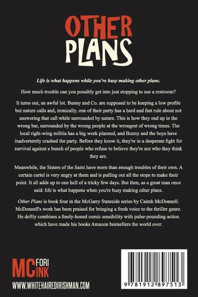 Life is what happens while you're busy making other plans. How much trouble can you possibly get into just stopping to use a restroom? As it turns out, an awful lot. Bunny and co are supposed to be keeping a low profile, but nature calls and ironically, one of their party has a hard and fast rule about not answering that call while surrounded by nature. This is how they end up in the wrong bar, surrounded by the wrong people at the wrongest of wrong times. The local right-wing militia has a big week planned, and Bunny and the boys have inadvertently crashed the party. Before they know it, they're in a desperate fight for survival against a bunch of people who refuse to believe they're not who they think they are. Meanwhile, the Sisters of the Saint have more than enough troubles of their own. A certain cartel is very angry at them and is pulling out all the stops to make their point. It all adds up to one hell of a tricky few days. But then, as a great man once said: life is what happens when you're busy making other plans. Other Plans is book four in the McGarry Stateside series by Caimh McDonnell. McDonnell's work has been praised for bringing a fresh voice to the thriller genre. He deftly combines a finely honed comic sensibility with pulse-pounding action which have made his books Amazon bestsellers the world over.
