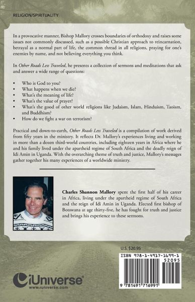 In a provocative manner, Bishop Mallory crosses boundaries of orthodoxy and raises some issues not commonly discussed, such as a possible Christian approach to reincarnation, betrayal as a normal part of life, the common thread in all religions, praying for one's enemies by name, and not believing everything you think. In Other Roads Less Traveled, he presents a collection of sermons and meditations that ask and answer a wide range of questions: ¿ Who is God to you? ¿ What happens when we die? ¿ What's the meaning of life? ¿ What's the value of prayer? ¿ What's the good of other world religions like Judaism, Islam, Hinduism, Taoism, and Buddhism? ¿ How do we fight a war on terrorism? Practical and down-to-earth, Other Roads Less Traveled is a compilation of work derived from fifty years in the ministry. It reflects Dr. Mallory's experiences living and working in more than a dozen third-world countries, including eighteen years in Africa where he and his family lived under the apartheid regime of South Africa and the deadly reign of Idi Amin in Uganda. With the overarching theme of truth and justice, Mallory's messages gather together his many experiences of a worldwide ministry.