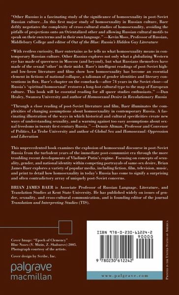 Baer s immensely readable volume adds greatly to the scholarship on post-Soviet culture as well as gender and sexuality studies; his original and incisive analysis uncovers the ways in which discussions about (Russian) homosexuality signify the Russian populace s eclectic attempts to construct a post-Soviet identity and aesthetic. - The Russian Review " Other Russias is a fascinating study of the significance of homosexuality in post-Soviet Russian culture . . .In this first major study of homosexuality in Russian culture, Baer deftly negotiates the complexity of cross-cultural studies of homosexuality, avoiding the pitfalls of projections onto an Orientalized other and allowing Russian cultural motifs to speak on their own terms and in their own language." - Kevin Moss, Professor of Russian, Middlebury College and editor of Out of the Blue: Russia s Hidden Gay Literature ."With restless curiosity, Baer entertains as he tells us what homosexuality means in contemporary Russian culture. Other Russias explores not only what a globalizing Western eye has made of queerness in Moscow (and beyond), but what Russians themselves have made of the sexual other in their midst. Baer s intelligent readings of post-Soviet high- and low-brow literature and films show how homosexuality has become an essential element in fictions of national collapse, a talisman of gender identities and literary conventions in flux. Baer s chapter on the comeback - after 74 years in the Soviet close - of Russia s spiritual homosexual restores a long-lost cultural type to the map of European culture. This book will be essential reading for all queer studies enthusiasts." - Dan Healey, Swansea University and author of Homosexual Desire in Revolutionary Russia "Through a close reading of post-Soviet literature and film, Baer illuminates the complexities of changing assumptions about homosexuality in contemporary Russia. A fascinating illustration of the ways in which historical and cultural specificities create new ways of understanding sexuality, and a warning against too easy assumptions about sexual freedoms in twenty first century Russia." - Dennis Altman, Professor and Convenor of Politics, La Trobe University and author of Global Sex and Homosexual "Baer has written a groundbreaking study of the discourse surrounding homosexuality as a reflection of Russian post-Soviet identity from the late 1980s through the Putin presidency. Effectively deploying historical and geographical frameworks, the author juxtaposes inherently Russian associations to the notion of homosexuality as a Western import that threatens Russian male identity. Essential" - CHOICE