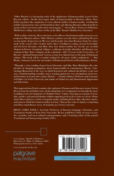 Baer s immensely readable volume adds greatly to the scholarship on post-Soviet culture as well as gender and sexuality studies; his original and incisive analysis uncovers the ways in which discussions about (Russian) homosexuality signify the Russian populace s eclectic attempts to construct a post-Soviet identity and aesthetic. - The Russian Review " Other Russias is a fascinating study of the significance of homosexuality in post-Soviet Russian culture . . .In this first major study of homosexuality in Russian culture, Baer deftly negotiates the complexity of cross-cultural studies of homosexuality, avoiding the pitfalls of projections onto an Orientalized other and allowing Russian cultural motifs to speak on their own terms and in their own language." - Kevin Moss, Professor of Russian, Middlebury College and editor of Out of the Blue: Russia s Hidden Gay Literature ."With restless curiosity, Baer entertains as he tells us what homosexuality means in contemporary Russian culture. Other Russias explores not only what a globalizing Western eye has made of queerness in Moscow (and beyond), but what Russians themselves have made of the sexual other in their midst. Baer s intelligent readings of post-Soviet high- and low-brow literature and films show how homosexuality has become an essential element in fictions of national collapse, a talisman of gender identities and literary conventions in flux. Baer s chapter on the comeback - after 74 years in the Soviet close - of Russia s spiritual homosexual restores a long-lost cultural type to the map of European culture. This book will be essential reading for all queer studies enthusiasts." - Dan Healey, Swansea University and author of Homosexual Desire in Revolutionary Russia "Through a close reading of post-Soviet literature and film, Baer illuminates the complexities of changing assumptions about homosexuality in contemporary Russia. A fascinating illustration of the ways in which historical and cultural specificities create new ways of understanding sexuality, and a warning against too easy assumptions about sexual freedoms in twenty first century Russia." - Dennis Altman, Professor and Convenor of Politics, La Trobe University and author of Global Sex and Homosexual "Baer has written a groundbreaking study of the discourse surrounding homosexuality as a reflection of Russian post-Soviet identity from the late 1980s through the Putin presidency. Effectively deploying historical and geographical frameworks, the author juxtaposes inherently Russian associations to the notion of homosexuality as a Western import that threatens Russian male identity. Essential" - CHOICE