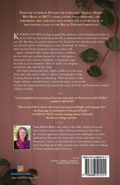 From the author of Outside the Limelight-named a Kirkus Best Book of 2017-comes a story about parenting, the performing arts, surviving high school and fighting back, in this gripping finale to the Ballet Theatre Chronicles. Katrina Devries, having navigated the cutthroat world of professional ballet to arrive at the top, has found the perfect life as a principal dancer and mother of a three-year-old. But when her partner announces he's found true love elsewhere and moves out, Katrina's perfect world begins to crack. Devastated, she turns to April, her best friend among the company's artistic staff. April, a seasoned ballet master and parent, is confident she can solve any problem thrown her way and plants a distraction at the studios: a handsome young pianist, eager for work as an accompanist. Only it's April's teen daughter, not Katrina, who falls for him, hard. Now April's dealing with new, tougher problems on the home front and at the studios, where a celebrity choreographer's ballet featuring Katrina borders on disturbing. When he and his ballet reveal violence-toward Katrina-April must make a controversial decision that upends protocol and imperils the careers both she and Katrina have worked a lifetime to build.