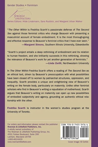 Scarth's project entails a deep rethinking of embodiment and its relation to human freedom and she brilliantly succeeds in this rethinking, showing the relevance of Beauvoir's work for yet another generation of feminists. -- Linda Zerilli, professor, Department of Political Science, Northwestern University [Scarth's] focus on the role and representation of the female body in Beauvoir's essay, and particularly on the maternal body, gives her analysis a clear and original focus. Times Literary Supplement, (Uk) Thoughtful and nuanced...an excellent introduction to some of the key debates that have sprung up in recent years in relation to The Second Sex. If offers a well-informed, subtle and often persuasive analysis of Beauvoir's text in the light of her essays on ethics. H-France Reviews The Other Within is Fredrika Scarth's passionate defense of The Second Sex against those feminist critics who charge Beauvoir with presenting a masculinist account of female embodiment. It is the most thorough-going and effective response to Beauvoir's feminist critics that I have ever seen. -- Margaret Simons, Southern Illinois University Edwardsville