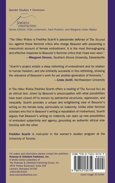 Scarth's project entails a deep rethinking of embodiment and its relation to human freedom and she brilliantly succeeds in this rethinking, showing the relevance of Beauvoir's work for yet another generation of feminists. -- Linda Zerilli, professor, Department of Political Science, Northwestern University [Scarth's] focus on the role and representation of the female body in Beauvoir's essay, and particularly on the maternal body, gives her analysis a clear and original focus. Times Literary Supplement, (Uk) Thoughtful and nuanced...an excellent introduction to some of the key debates that have sprung up in recent years in relation to The Second Sex. If offers a well-informed, subtle and often persuasive analysis of Beauvoir's text in the light of her essays on ethics. H-France Reviews The Other Within is Fredrika Scarth's passionate defense of The Second Sex against those feminist critics who charge Beauvoir with presenting a masculinist account of female embodiment. It is the most thorough-going and effective response to Beauvoir's feminist critics that I have ever seen. -- Margaret Simons, Southern Illinois University Edwardsville