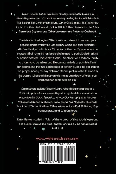 Other Worlds, Other Universes: Playing The Reality Game is a stimulating selection of consciousness expanding topics which include The Search For Extraterrestrial Life; Other Civilizations: The Prehistory Of Earth; Other Lifeforms: A Look At UFOs; Other Dimensions: The Astral Plane and Beyond; and Other Universes and Return to Godhead. The introduction begins: "This book is an attempt to expand your consciousness by playing The Reality Game. The term originates with Brad Steiger in his book Mysteries of Time and Space, where he suggests that humanity has been challenged to participate in a kind of cosmic contest—The Reality Game. The objective is to know reality, to understand ourselves and the cosmos as fully as possible. If man can apprehend the true significance of certain clues; if he can master the proper moves, he may obtain a clearer picture of his true role in the cosmic scheme of things—a role that is decidedly different from what common sense tells him it is." Contributors include Timothy Leary, who while serving time in a California prison for experimenting with psychedelics, donated an essay from his book, Terra II … A Way Out. Astrophysicist Jacques Vallee contributed a chapter from Passport to Magonia, his classic book on UFOs and folklore. Other writers include Rudolf Steiner, Yogi Ramacharaka and D. Scott Rogo. Kirkus Reviews called it "A bit of this, a pinch of that, toads' eyes and bat brains," making it a must-read for anyone on the metaphysical truth trail.
