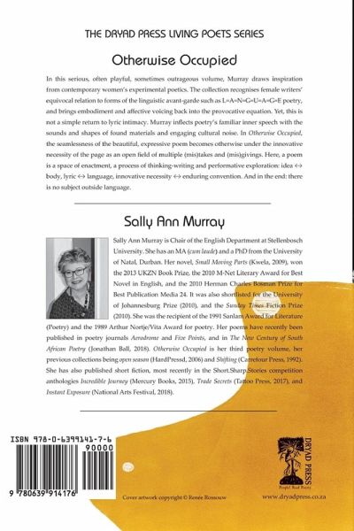 In this serious, often playful, sometimes outrageous volume, Murray draws inspiration from contemporary women's experimental poetics. The collection recognises female writers' equivocal relation to forms of the linguistic avant-garde such as L=A=N=G=U=A=G=E poetry, and brings embodiment and affective voicing back into the provocative equation. Yet, this is not a simple return to lyric intimacy. Murray inflects poetry's familiar inner speech with the sounds and shapes of found materials and engaging cultural noise. In Otherwise Occupied, the seamlessness of the beautiful, expressive poem becomes otherwise under the innovative necessity of the page as an open field of multiple (mis)takes and (mis)givings. Here, a poem is a space of enactment, a process of thinking-writing and performative exploration: idea ↔ body, lyric ↔ language, innovative necessity ↔ enduring convention. And in the end: there is no subject outside language.